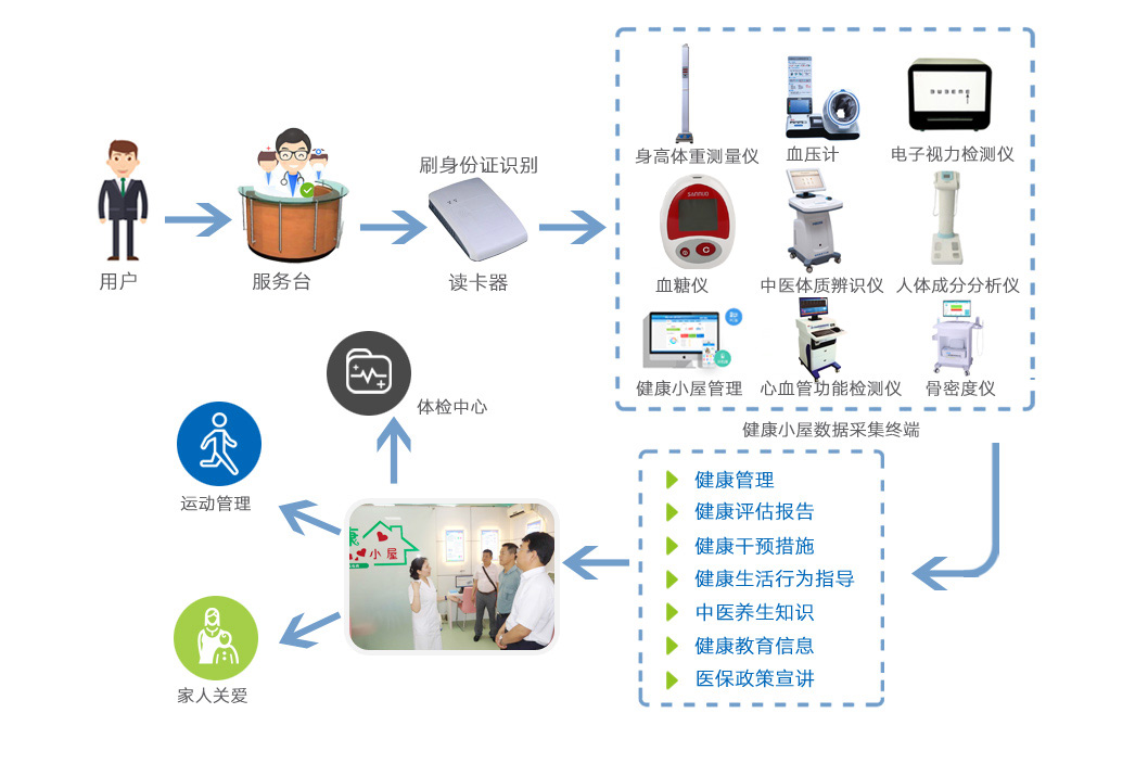 健康小屋方案可实现居民电子健康档案建立、治未病、慢病管理、健康关注等功能,向居民传播健康知识、健康运动、健康饮食、疾病预防等宣教,做到“早预防、早诊断、早治疗”,对百姓的健康管理带向多样化、全面化,是提升基层医疗机构影响力和基础职能的有效抓手。